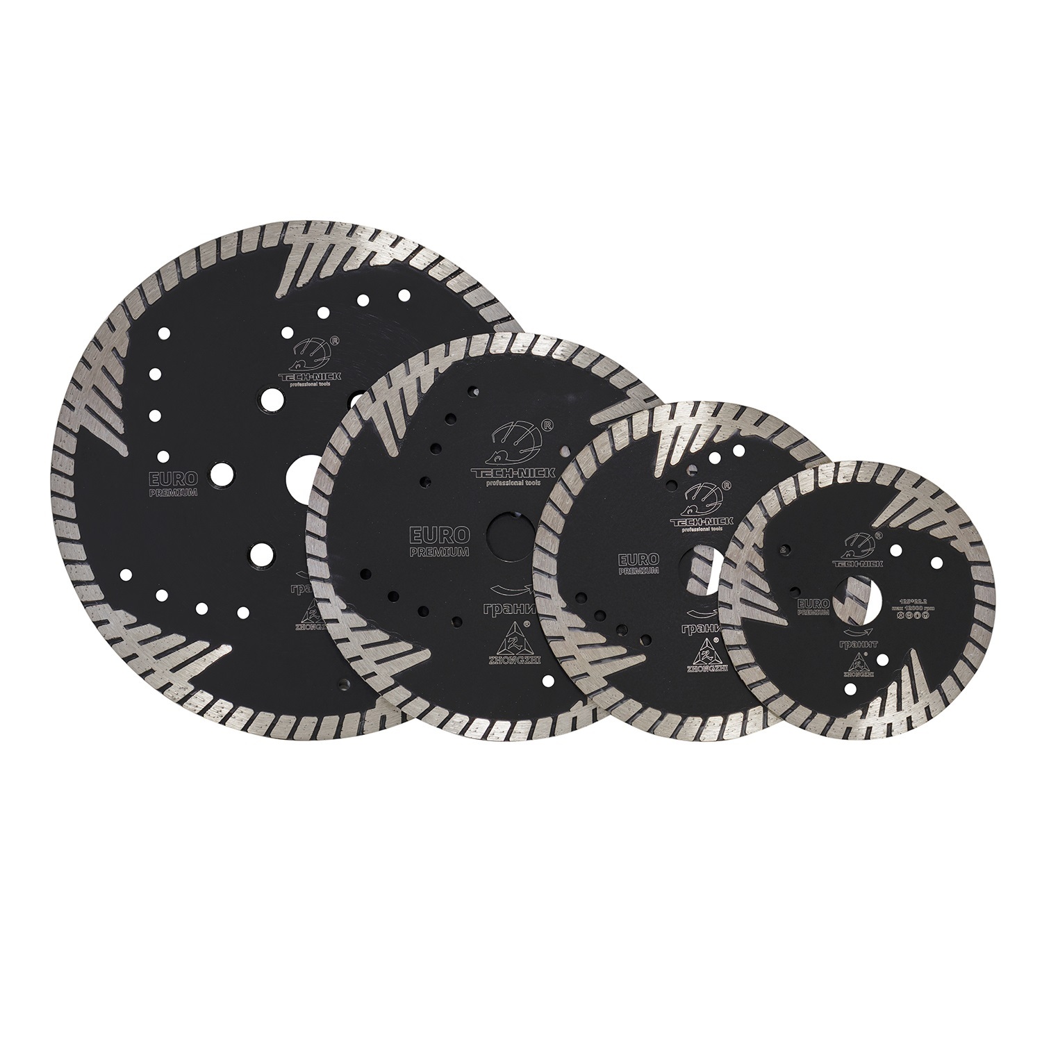 Профессиональные алмазные диски Tech-Nick EURO Premium по граниту. Форма сегмента позволяет работать без водяного охлаждения, а так же обрабатывать кромку камня.